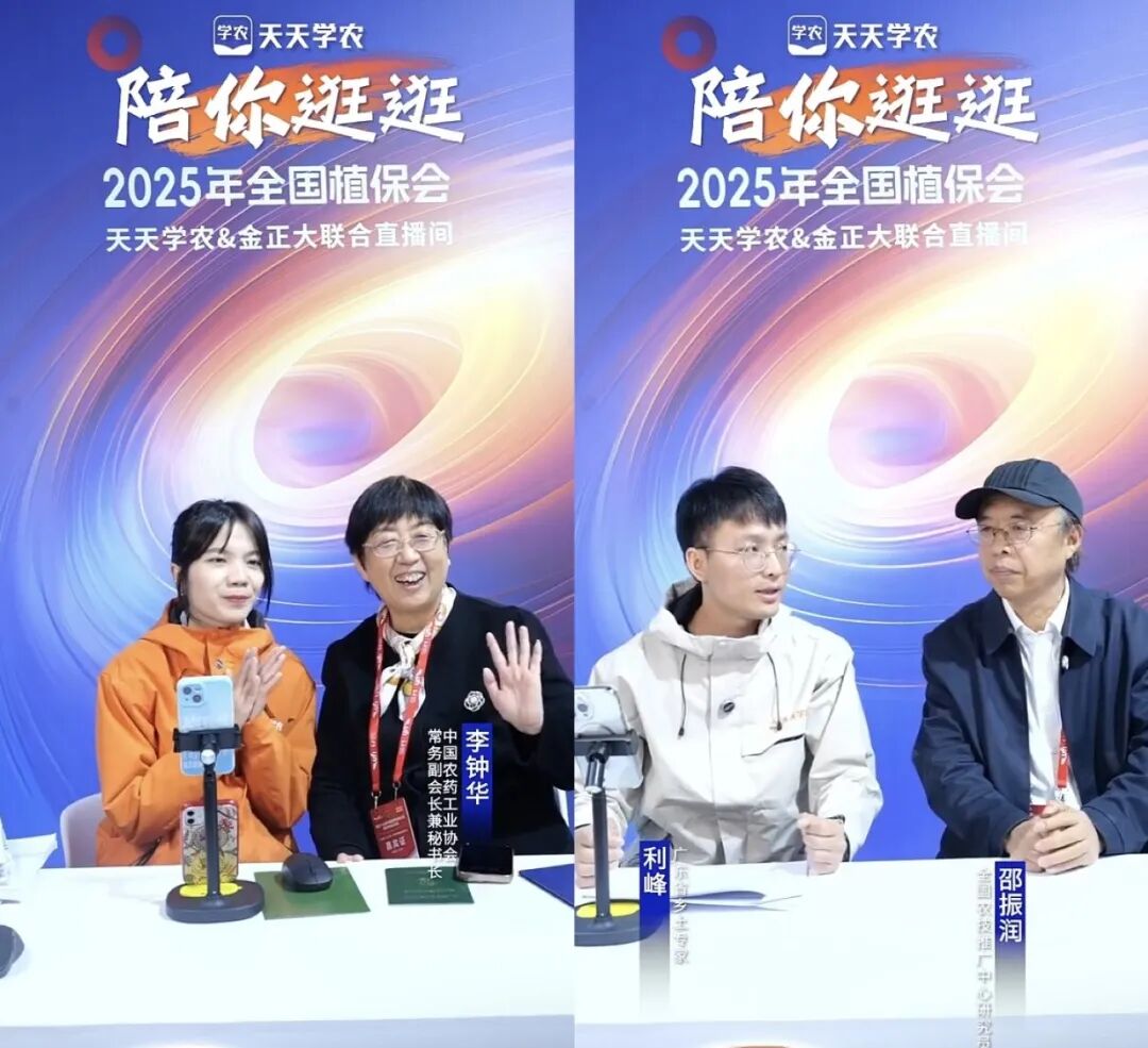 除了干货满满的主题演讲,丰农控股旗下天天学农还在展会现场同步开启“带你云游植保会” 直播活动,以 “行业大咖云集 + 实战内容聚焦” 的特色,成为展会最具人气的互动环节之一。直播特邀多位深耕农业领域的领导与企业高管重磅坐镇:中国农药工业协会常务副会长兼秘书长李钟华、全国农技推广中心药械处原处长邵振润,金正大研发总监任士伟、金丰学院资深植保专家蔡朋飞等,从行业政策导向、产业升级趋势宏观层面,实操案例分享、前沿技术应用与市场运营经验微观层面,帮助行业明晰发展方向,缓解企业对政策环境的信息不对称问题,为行业高质量发展筑牢认知基础,推动行业技术成果的高效转化,两大账号直播间累计场观人数高达4万人,推动行业交流从“线下单点”向“线上线下全域”升级。