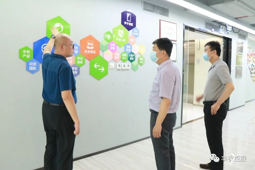 2020年6月5日,农业农村部国际合作司二级巡视员王宏前、农业农村部国际合作司欧亚处管大海参观丰农控股、深圳市场监督管理局农业处调研员毛秋荣等领导陪同来访。丰农控股合伙人、战略发展总经理范恒硕、丰诚上品CEO高聃、识农CEO谢秋发进行接待。