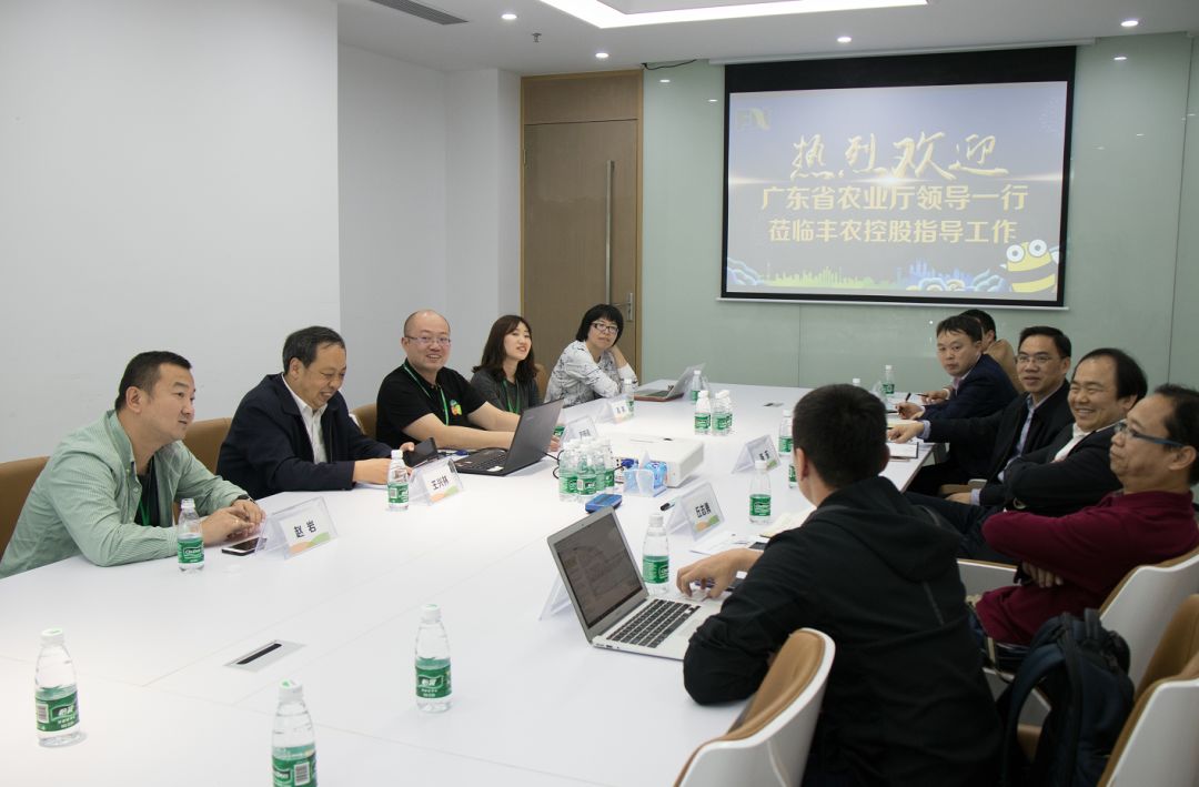 2019年2月15日下午,广东省农业厅陈东副厅长、广东省农业展览馆丘志勇馆长(广东省农业对外经济促进中⼼主任)、广东省农业厅市场与信息处刘晚治副处长等领导到大丰收深圳总部调研,深圳市市场监督管理局农牧处欧阳卫国处长陪同,大丰收战略发展总经理范恒硕、丰诚上品CEO高聃对广东省农业厅领导一行的来访表示热烈欢迎,并向陈厅长一行汇报了丰诚上品的发展历程及目前运营情况。