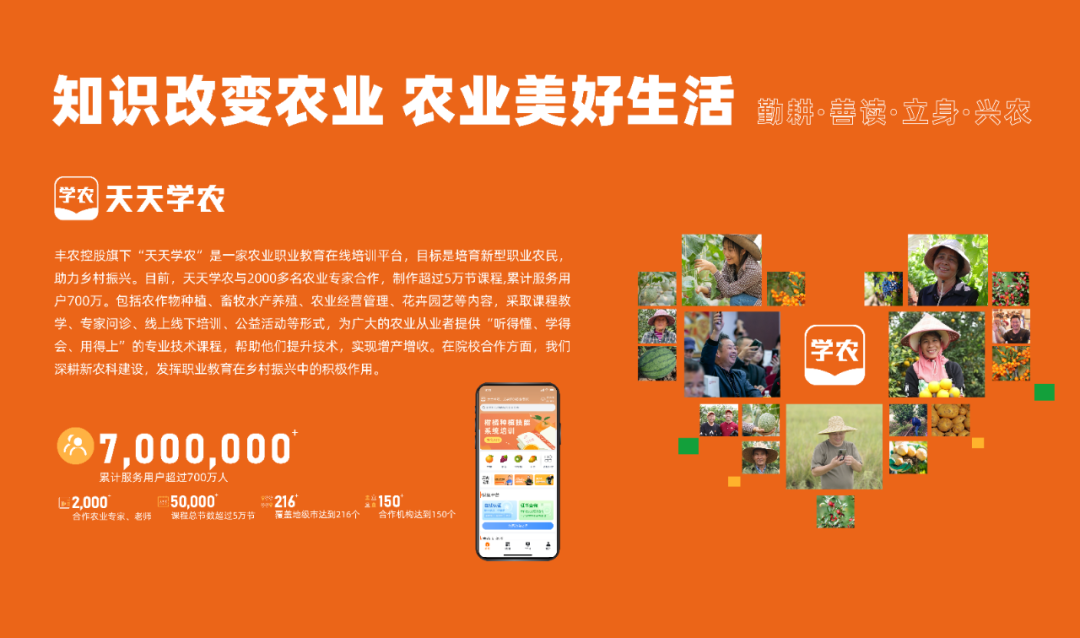 作为一家专注于农业职业教育在线服务平台,天天学农经过6年不断发展,打造出农业职业教育全新的内容时代。目前,天天学农与2000多名农业专家合作,制作超过5万节课程。包括农作物种植、畜牧水产养殖、农业经营管理等内容,采取课程教学、专家问诊、线上线下培训、公益活动等形式,服务职业农民及农业人员,帮助他们提升技术,实现增产增收。