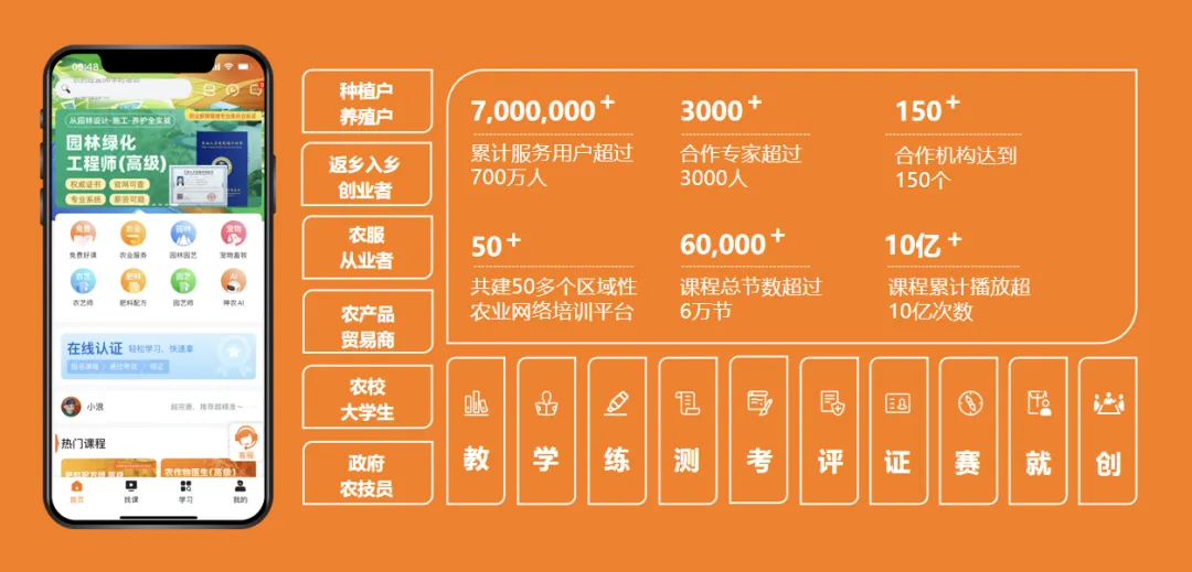 作为国内农业职业教育在线培训平台,天天学农秉承培育新型职业农民的目标,聚焦乡村振兴推进工作,形成具有人才培训特色、标准化、全方位的数智化服务模式。截至目前累计服务用户超过700万人,与3000余名专家合作,拥有超过6万节农业课程,形成“教、学、练、测、考、评、证、赛、就、创”十大教育机制,在大力普及农业职业教育,提升农业生产技术,精准培训新型职业农民等诸多方面高度契合乡村振兴战略和人才振兴政策要求,在农业新职业人才的培养上颇具成果。